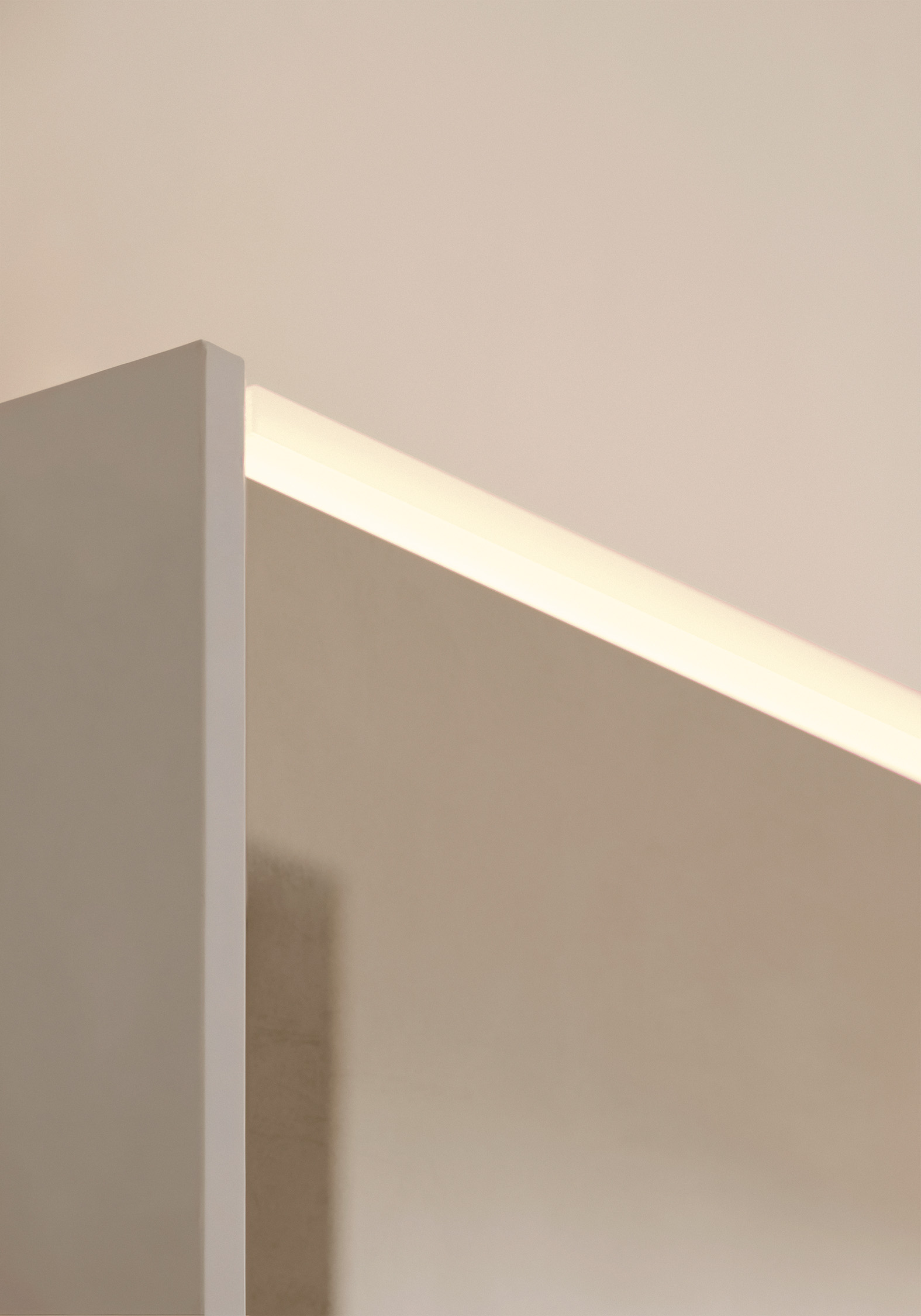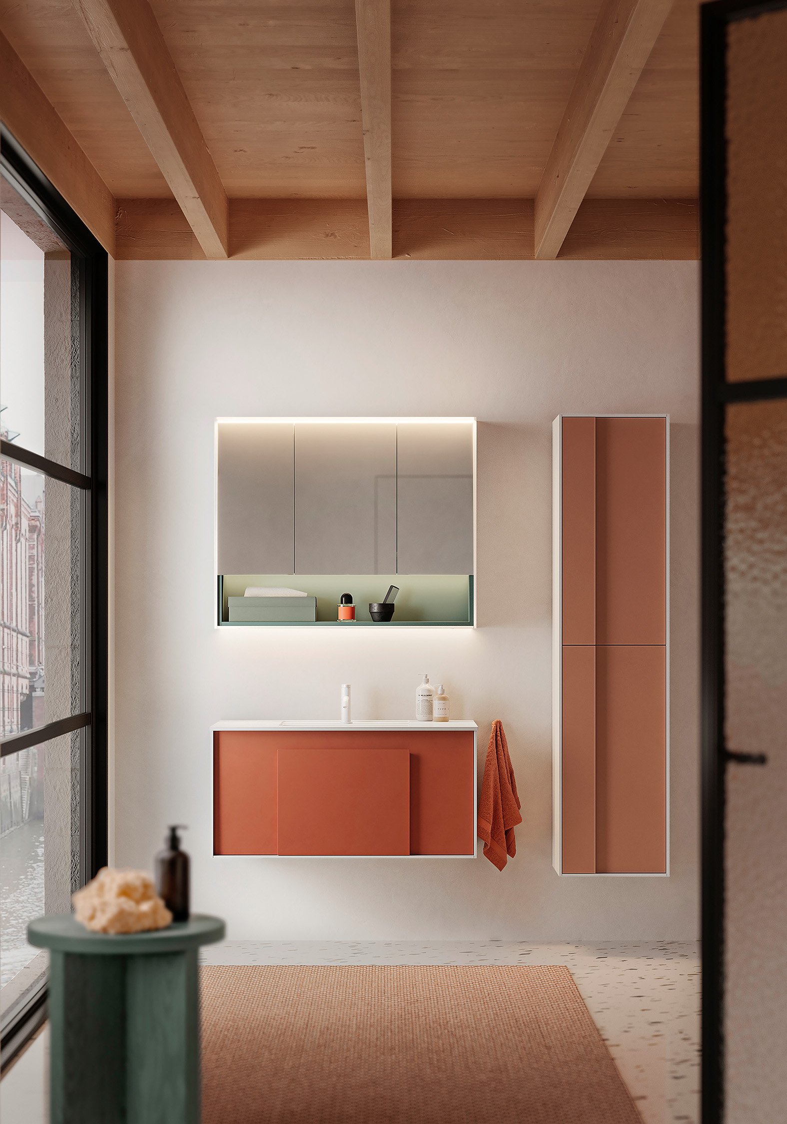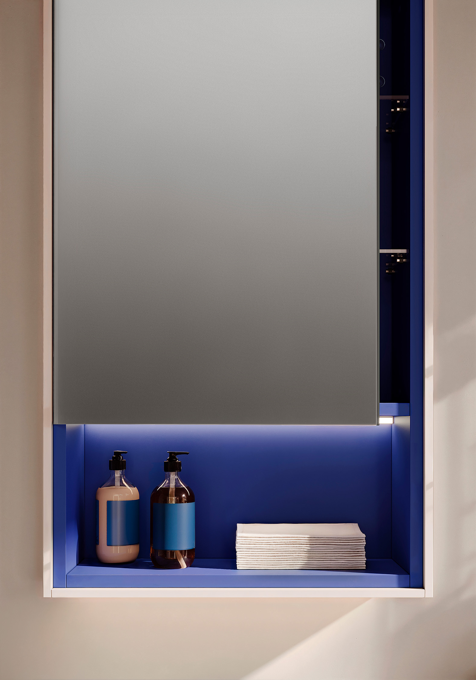 Genauso wichtig für die Farbwirkung von Moto wie der Waschtischunterschrank ist der passend zu allen Waschtisch-Breiten erhältliche, 2- bis 4-türige Spiegelschrank. Denn das bei allen Modellen integrierte offene Fach bietet über die Farbgestaltung der Nische ein zusätzliches Element zur Schaffung individueller Farbklänge. Verstärkt durch eine über die gesamte Fachbreite laufende LED-Beleuchtung können sie eine den ganzen Raum erfassende Atmosphäre entfalten. Erzielt wird dieser Effekt durch eine innenliegende Aufdopplung des weißen Korpus; die so entstehende Nischenauskleidung kann vom Außenkorpus getrennt gewählt werden, sodass der Spiegelschrank innen farbgleich oder in Variation zur Waschtischfront zu gestalten ist. Da auch hier wieder Wunschfarben wählbar sind, eröffnet sich mit dem Spiegelschrank eine schier unendliche Vielfalt an Kombination, um individuelle Farbharmonien oder -kontraste zu kreieren.